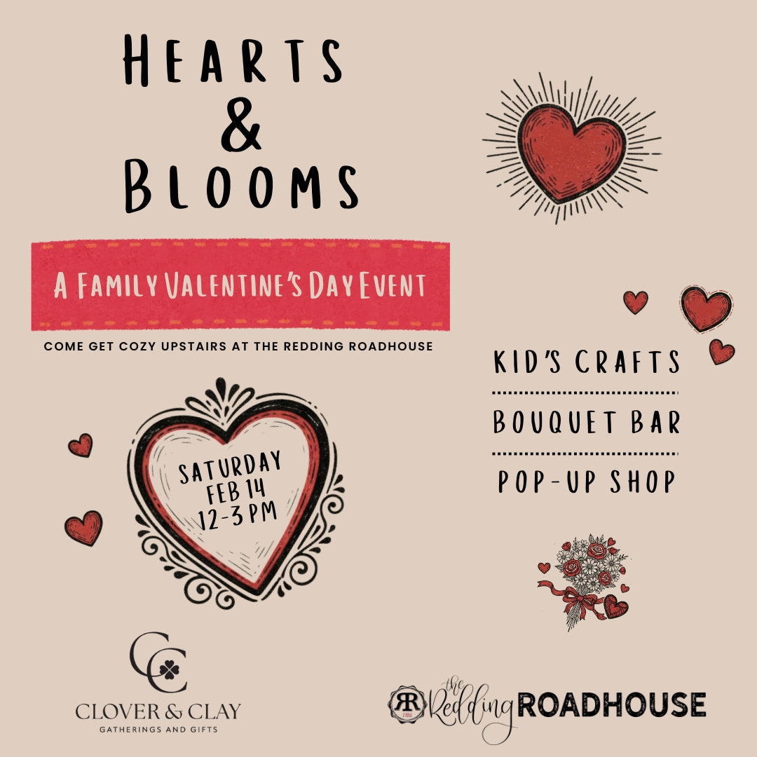 Join us upstairs at the Redding Roadhouse for Hearts & Blooms, a cozy, family-friendly Valentine’s Day celebration hosted by Clover & Clay.